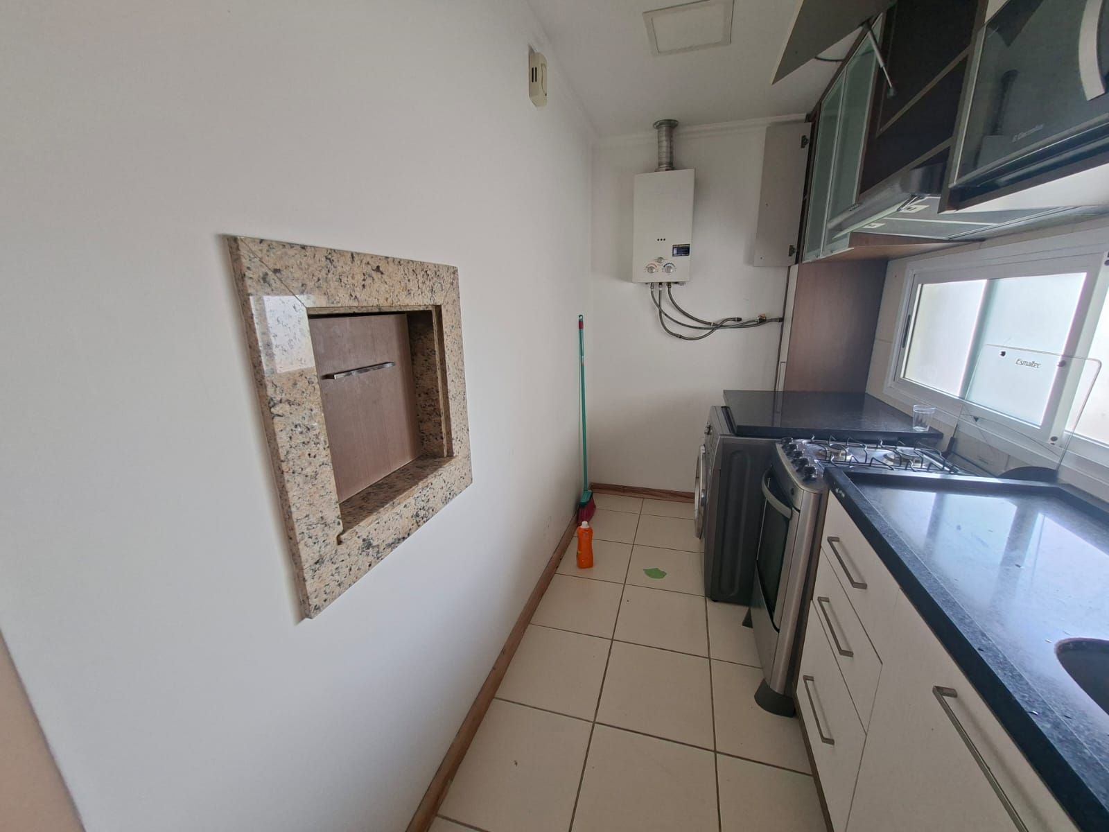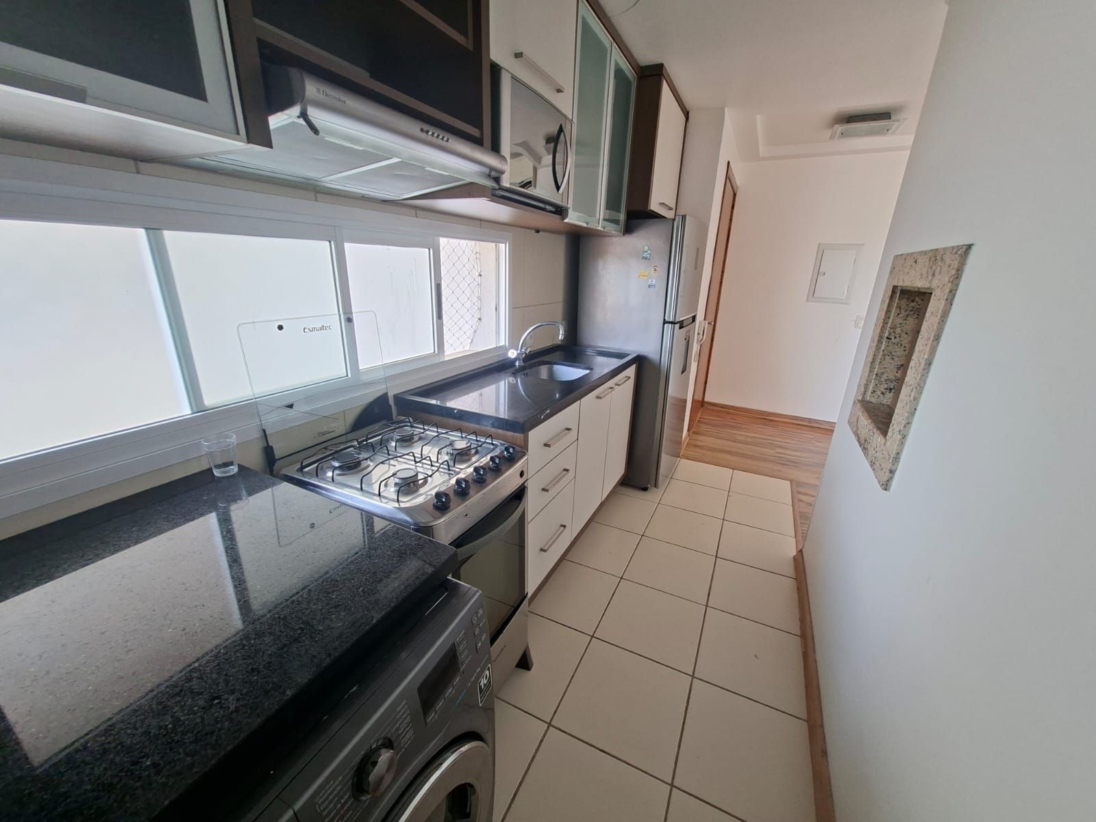 Imóvel semi mobiliado, contando com geladeira, cooktop, churrasqueira, armários planejados na cozinha e no quarto, além de rack na sala.