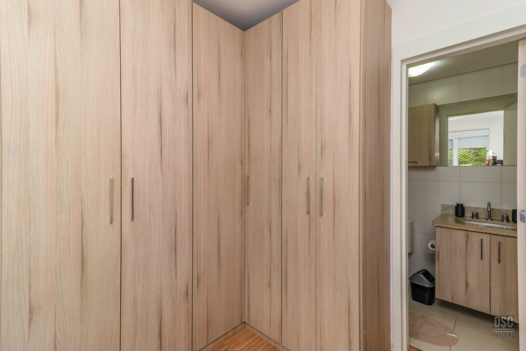 A suíte possui armários instalados, espera para ar condicionado, piso laminado.