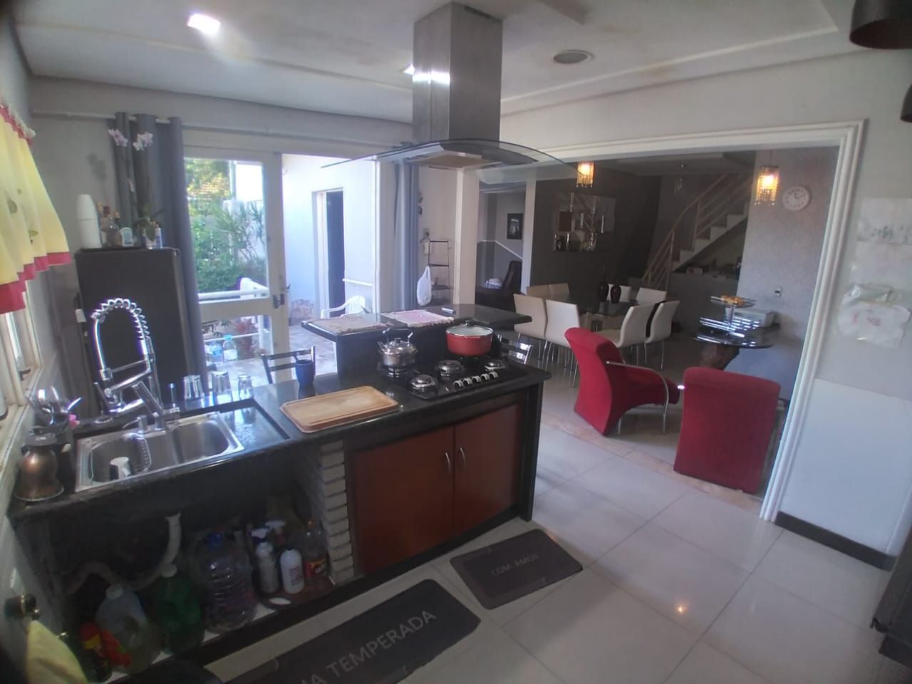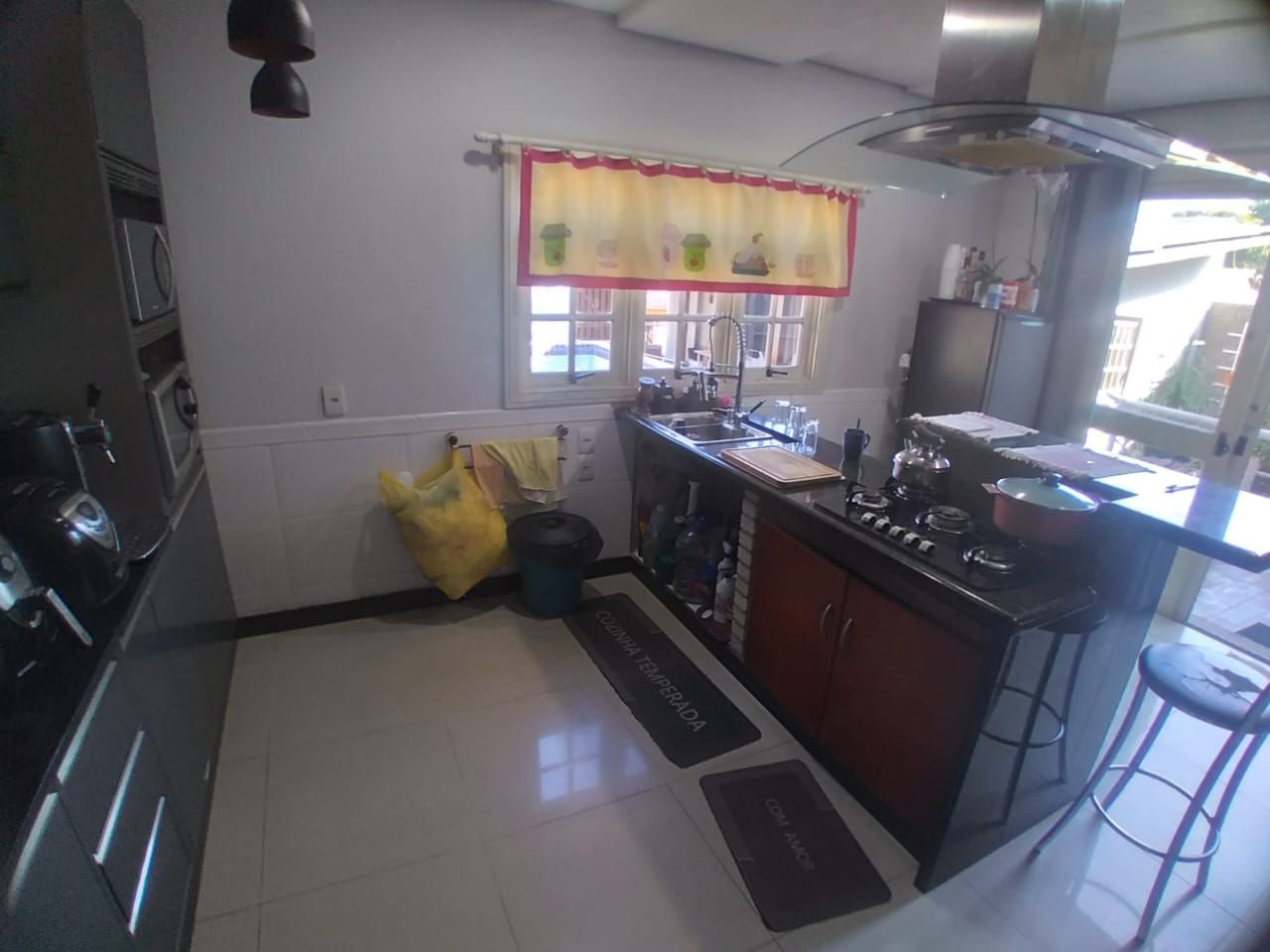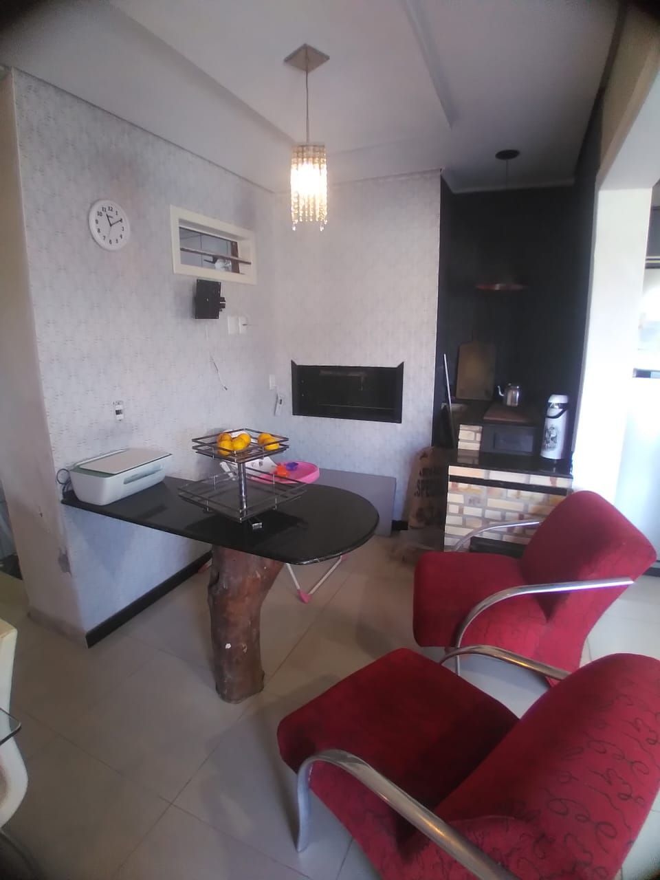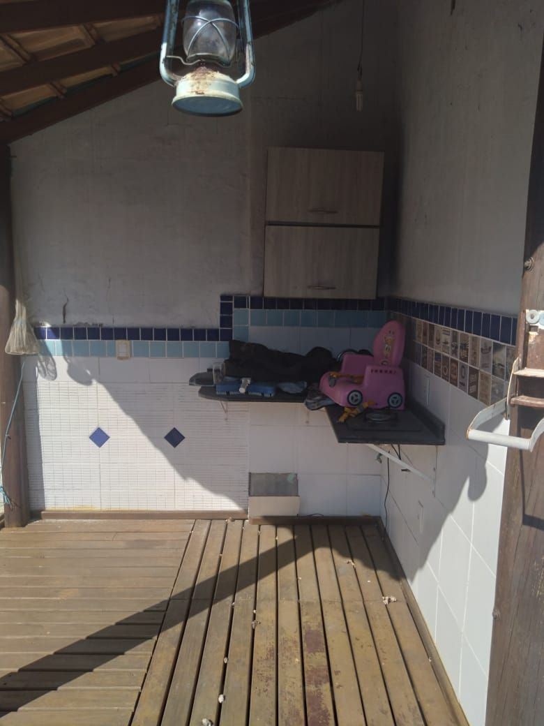 A área social é composta por sala de estar e jantar integradas, fogão a lenha em alvenaria, churrasqueira e cozinha americana planejada com armários sob medida.