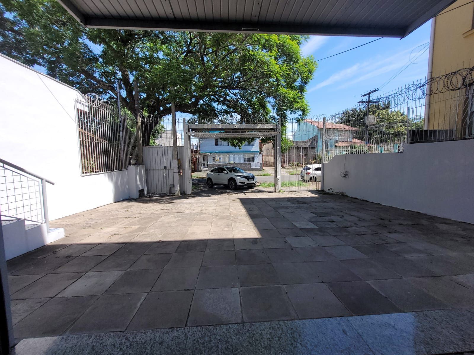 O imóvel dispõe de três banheiros, sendo um com box, área com churrasqueira no segundo andar e portão de grande porte, ideal para entrada de veículos ou carga e descarga.