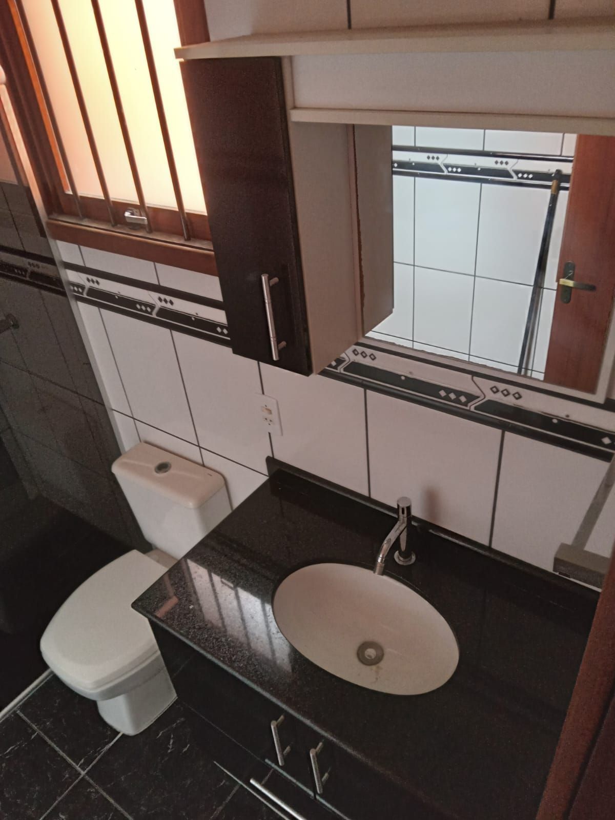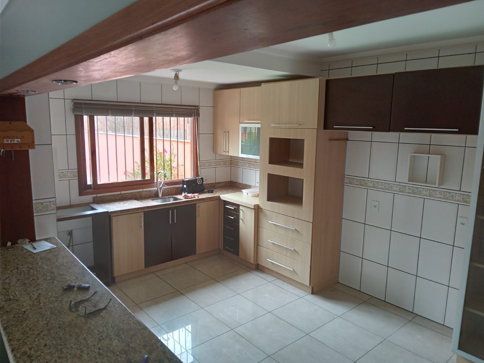 No pavimento térreo, o imóvel conta com living em dois ambientes, composto por sala de estar e sala de jantar, além de lavabo e cozinha mobiliada com móveis fixos, proporcionando praticidade no dia a dia.