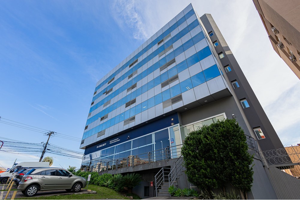 O edifício apresenta arquitetura corporativa, portaria com controle de acesso por cartão, elevador e rampa de acesso.