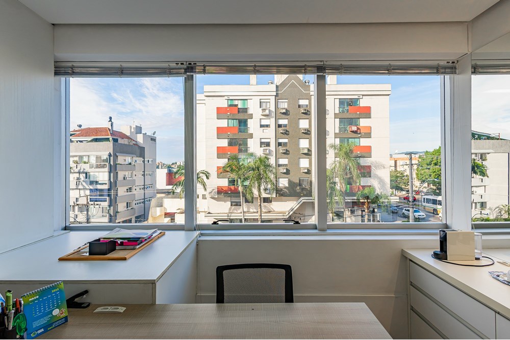 Os ambientes da sala comercial estão impecáveis, com projeto assinado por arquitetas, marcenaria sob medida, forro, luminárias, acabamentos de qualidade e quatro aparelhos de ar-condicionado tipo split já instalados. A sala é voltada para a frente do edifício, com orientação leste, recebendo sol pela manhã.